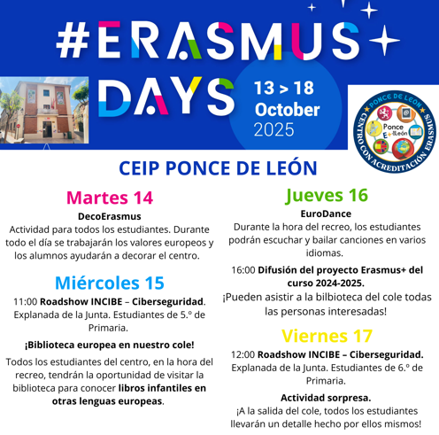 Del 13 al 18 de octubre de 2025, el CEIP Ponce de León ha celebrado una nueva edición de los Erasmus Days, una iniciativa internacional destinada a difundir los valores europeos y a compartir los proyectos escolares desarrollados dentro del programa Erasmus+.